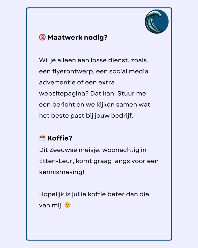 Ook voor kleine marketingklusjes kun je bij mij terecht! Of het nu gaat om een e-mailhandtekening, een flyer, visitekaartjes of een social media post – ik help je graag. Geen groot project nodig, maar wel iets moois? Stuur me een berichtje!